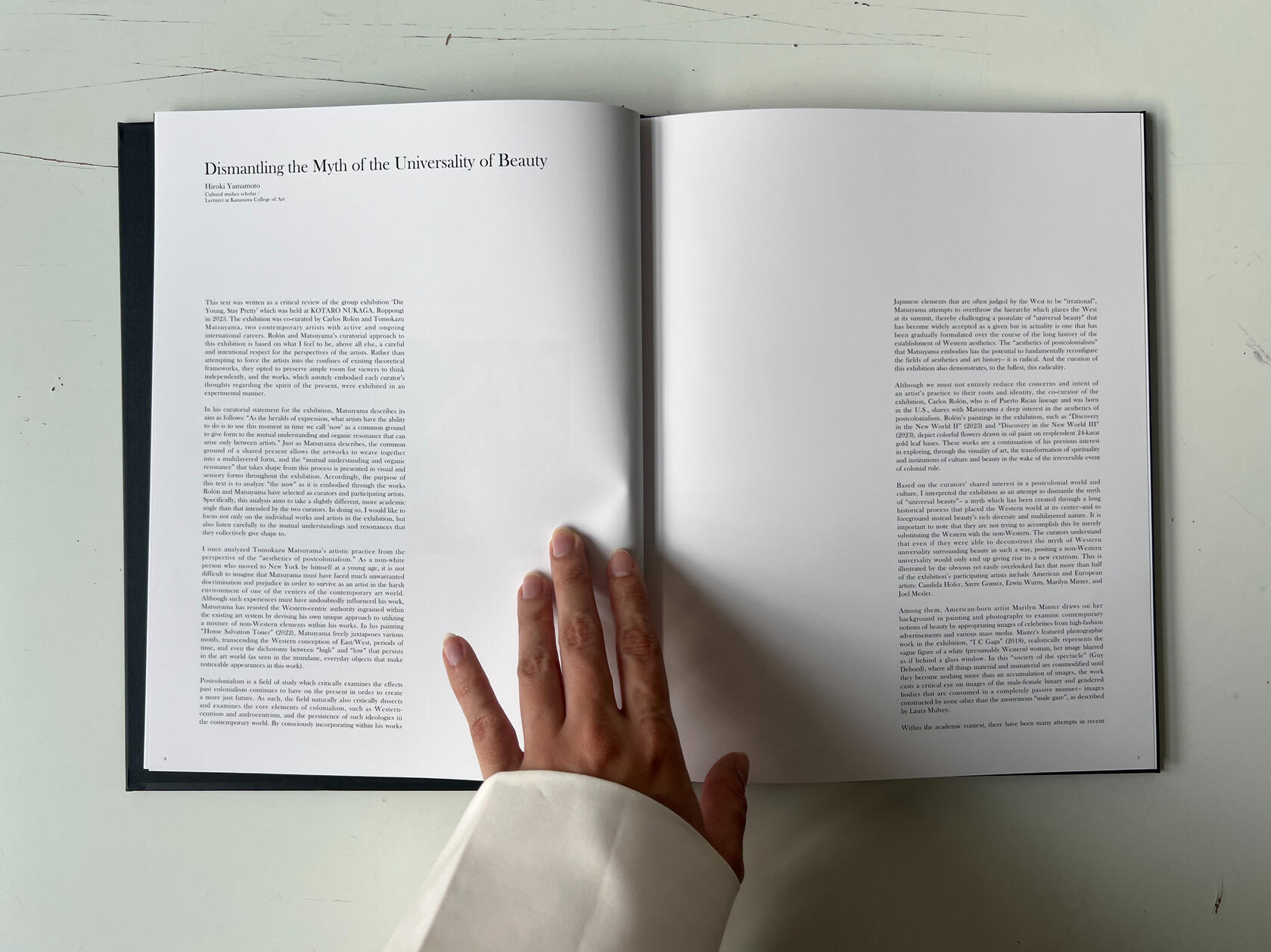 This text was written as a critical review of the group exhibition ‘Die Young, Stay Pretty’ which was held at KOTARO NUKAGA, Roppongi in 2023. The exhibition was co-curated by Carlos Rolón and Tomokazu Matsuyama, two contemporary artists with active and ongoing international careers. Rolón and Matsuyama’s curatorial approach to this exhibition is based on what I feel to be, above all else, a careful and intentional respect for the perspectives of the artists. Rather than attempting to force the artists into the confines of existing theoretical frameworks, they opted to preserve ample room for viewers to think independently, and the works, which astutely embodied each curator’s thoughts regarding the spirit of the present, were exhibited in an experimental manner.In his curatorial statement for the exhibition, Matsuyama describes its aim as follows: “As the heralds of expression, what artists have the ability to do is to use this moment in time we call ‘now’ as a common ground to give form to the mutual understanding and organic resonance that can arise only between artists.” Just as Matsuyama describes, the common ground of a shared present allows the artworks to weave together into a multilayered form, and the “mutual understanding and organic resonance” that takes shape from this process is presented in visual and sensory forms throughout the exhibition. Accordingly, the purpose of this text report is to analyze “the now” as it is embodied through the works Rolón and Matsuyama have selected as curators and participating artists. Specifically, this analysis aims to take a slightly different, more academic angle than that intended by the two curators. In doing so, I would like to focus not only on the individual works and artists in the exhibition, but also listen carefully to the mutual understandings and resonances that they collectively give shape to.I once analyzed Tomokazu Matsuyama's artistic practice from the perspective of the “aesthetics of postcolonialism.” As a non-white person who moved to New York by himself at a young age, it is not difficult to imagine that Matsuyama must have faced much unwarranted discrimination and prejudice in order to survive as an artist in the harsh environment of one of the centers of the contemporary art world. Although such experiences must have undoubtedly influenced his work, Matsuyama has resisted the Western-centric authority ingrained within the existing art system by devising his own unique approach to utilizing a mixture of non-Western elements within his works. In his painting "Home Salvation Toner" (2022), Matsuyama freely juxtaposes various motifs, transcending the Western conception of East/West, periods of time, and even the dichotomy between "high" and "low" that persists in the art world (as seen in the mundane, everyday objects that make noticeable appearances in this work).Postcolonialism is a field of study which critically examines the effects past colonialism continues to have on the present in order to create a more just future. As such, the field naturally also critically dissects and examines the core elements of colonialism, such as Western-centrism and androcentrism, and the persistence of such ideologies in the contemporary world. By consciously incorporating within his works Japanese elements that are often judged by the West to be "irrational," Matsuyama attempts to overthrow the hierarchy which places the West at its summit, thereby challenging a postulate of "universal beauty" that has become widely accepted as a given but in actuality is one that has been gradually formulated over the course of the long history of the establishment of Western aesthetics. The "aesthetics of postcolonialism" that Matsuyama embodies has the potential to fundamentally reconfigure the fields of aesthetics and art history– it is radical. And the curation of this exhibition also demonstrates, to the fullest, this radicality.Although we must not entirely reduce the concerns and intent of an artist'’s practice to their roots and identity, the co-curator of the exhibition, Carlos Rolón, who is of Puerto Rican lineage and was born in the U.S., shares with Matsuyama a deep interest in the aesthetics of postcolonialism. Rolón’s paintings in the exhibition, such as "“Discovery in the New World II"” (2023) and "“Discovery in the New World III"” (2023), depict colorful flowers drawn in oil paint on resplendent 24-karat gold leaf bases. These works are a continuation of his previous interest in exploring, through the visuality of art, the transformation of spirituality and institutions of culture and beauty in the wake of the irreversible event of colonial rule.Based on the curators’ shared interest in a postcolonial world and culture, I interpreted the exhibition as an attempt to dismantle the myth of "universal beauty"– a myth which has been created through a long historical process that placed the Western world at its center– and to foreground instead beauty’s rich diversity and multilayered nature. It is important to note that they are not trying to accomplish this by merely substituting the Western with the non-Western. The curators understand that even if they were able to deconstruct the myth of Western universality surrounding beauty in such a way, positing a non-Western universality would only end up giving rise to a new centrism. This is illustrated by the obvious yet easily overlooked fact that more than half of the exhibition's participating artists include American and European artists: Candida Höfer, Sayre Gomez, Erwin Wurm, Marilyn Minter, and Joel Mesler.Among them, American-born artist Marilyn Minter draws on her background in painting and photography to examine contemporary notions of beauty by appropriating images of celebrities from high-fashion advertisements and various mass media. Minter's featured painting (photographic work) in the exhibition, "I C Gaga" (2018), realisti